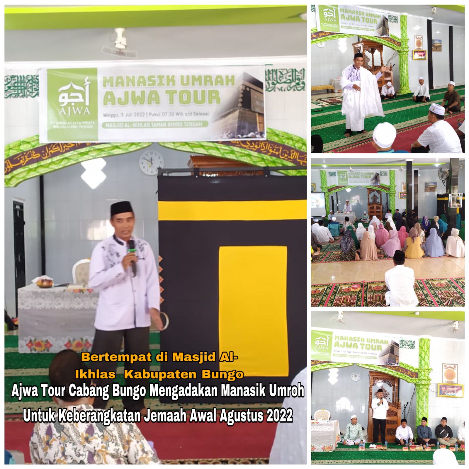 SUARA BUNGO – Ajwa Tour Cabang Bungo, Provinsi Jambi melaksanakan kegiatan manasik Umroh yang bertempat di Masjid Al-Ikhlas Kabupaten Bungo, Minggu (3/7/2022).