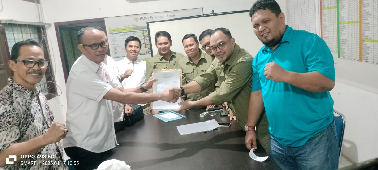 Mat Sanusi mendatangi Kantor KONI Provinsi Jambi, Jln Halim Perdana Kusuma, Nomor 40, Sungai Asam, Kec Pasar Jambi Kota Jambi bersama Ketua Tim Pemenangan, Heri yang menjabat sebagai ketua Panahan Provinsi Jambi.