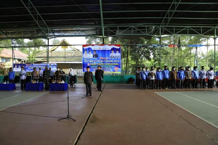 Upacara peringatan HUT PGRI Ke 75 dan Hari Guru Nasional tahun 2020 dilakukan dengan menerapkan protokol kesehatan ini, bertema “Kreatifitas dan dedikasi guru menuju Indonesia Maju”.