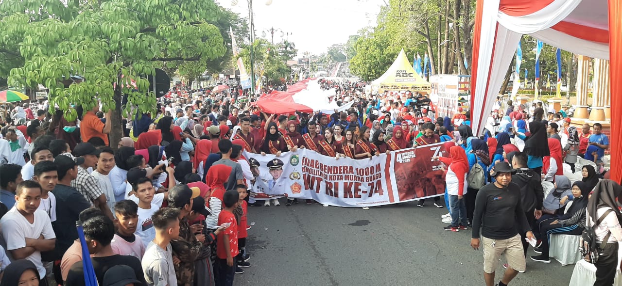 Terlihat, bendera merah putih sepanjang 1000 meter tersebut di arak oleh ribuan masyarakat mengelilingi Kota Muara Bungo. Adapun acaranya dimulai dari pukul, 07.00 Wib, yang di awali dengan senam bersama tepatnya di arena Care Free Day depan rumah dinas Bupati Bungo.