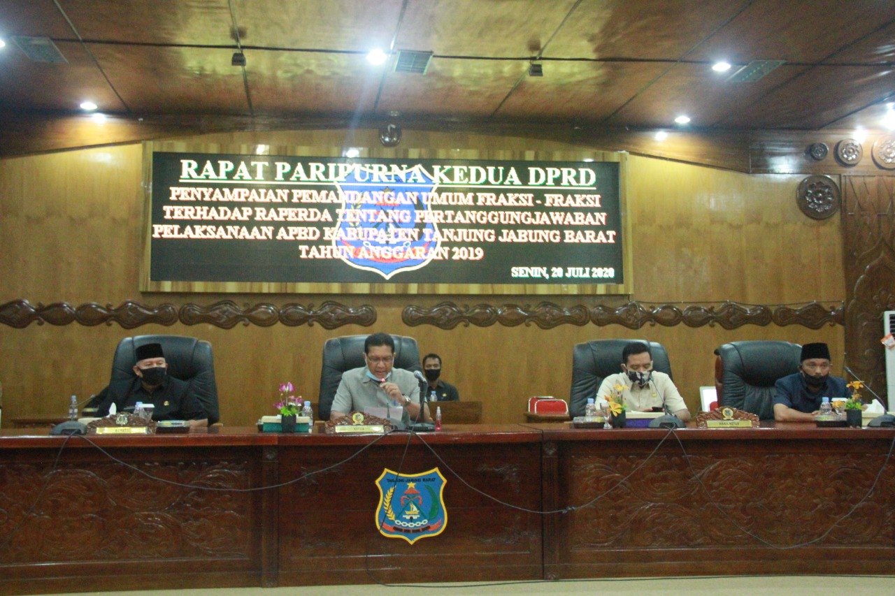 SUARA TANJABBAR – Bupati Tanjung Jabung Barat, Dr. Ir. H. Safrial, MS hadiri rapat paripurna ke-dua yang mengagendakan penyampaian pandangan umum Fraksi – Fraksi Dewan Perwakilan Rakyat Daerah Kabupaten (DPRD) Tanjung Jabung Barat atas Ranperda tentang pertanggungjawaban Pelaksanaan APBD Tahun Anggaran 2019 yang disampaikan Bupati Tanjung Jabung Barat pada Rapat Paripurna pertama beberapa waktu lalu.
