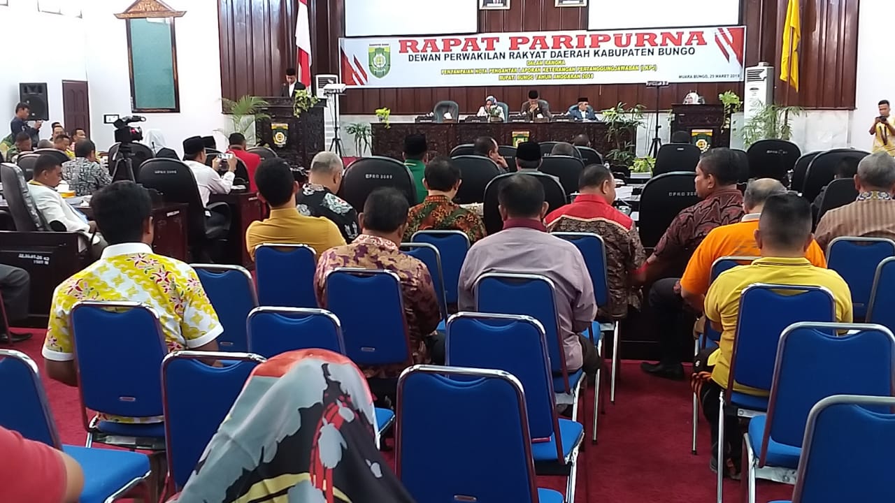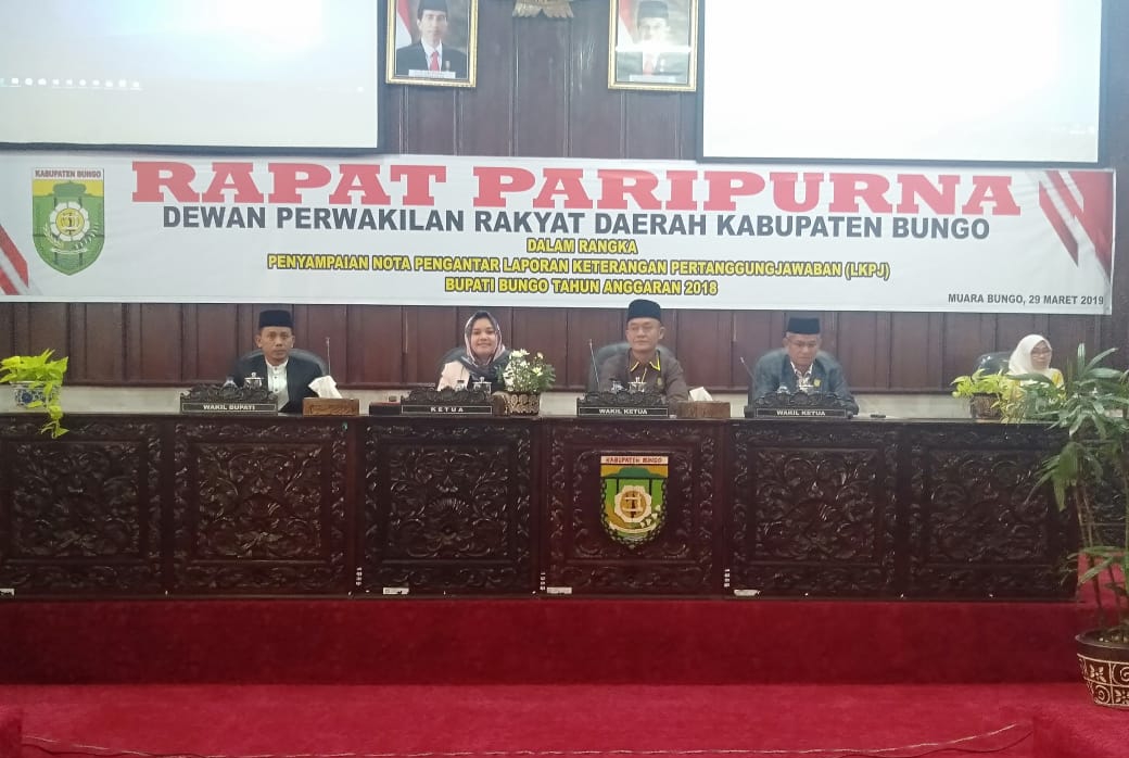 SUARA BUNGO – Dewan Perwakilan Rakyat Daerah (DPRD) Kabupaten Bungo sukses gelar Rapat Paripurna dengan agenda Penyampaian Nota Pengantar Laporan Keuangan Pertanggung Jawaban (LKPJ) Bupati Bungo tahun anggaran 2018 di aula rapat DPRD Kabupaten Bungo, Jum’at (29/3/2019).