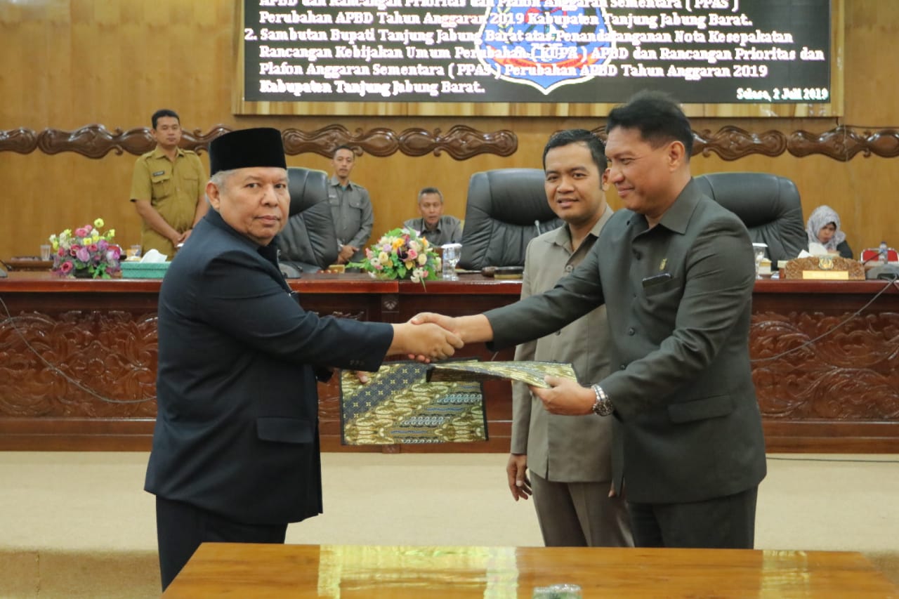 SUARA TANJABBAR – DRPD Tanjab Barat melakukan penandatanganan nota kesepakatan KUPA-PPAS perubahan APBD tahun 2019 bersama Bupati Tanjab Barat di gedung DPRD Tanjab Barat, Selasa (2/7/2019).