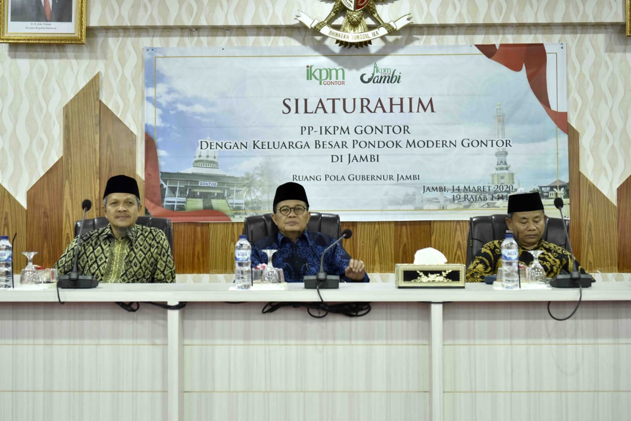SUARA JAMBI – Silaturahim Pemerintah Provinsi Jambi bersama Pengurus Pusat Ikatan Keluarga Pondok Modern Gontor dengan Keluarga Besar Pondok Modern Gontor Jambi berlangsung di Ruang Pola Kantor Gubernur Jambi, Sabtu (14/3/2020).