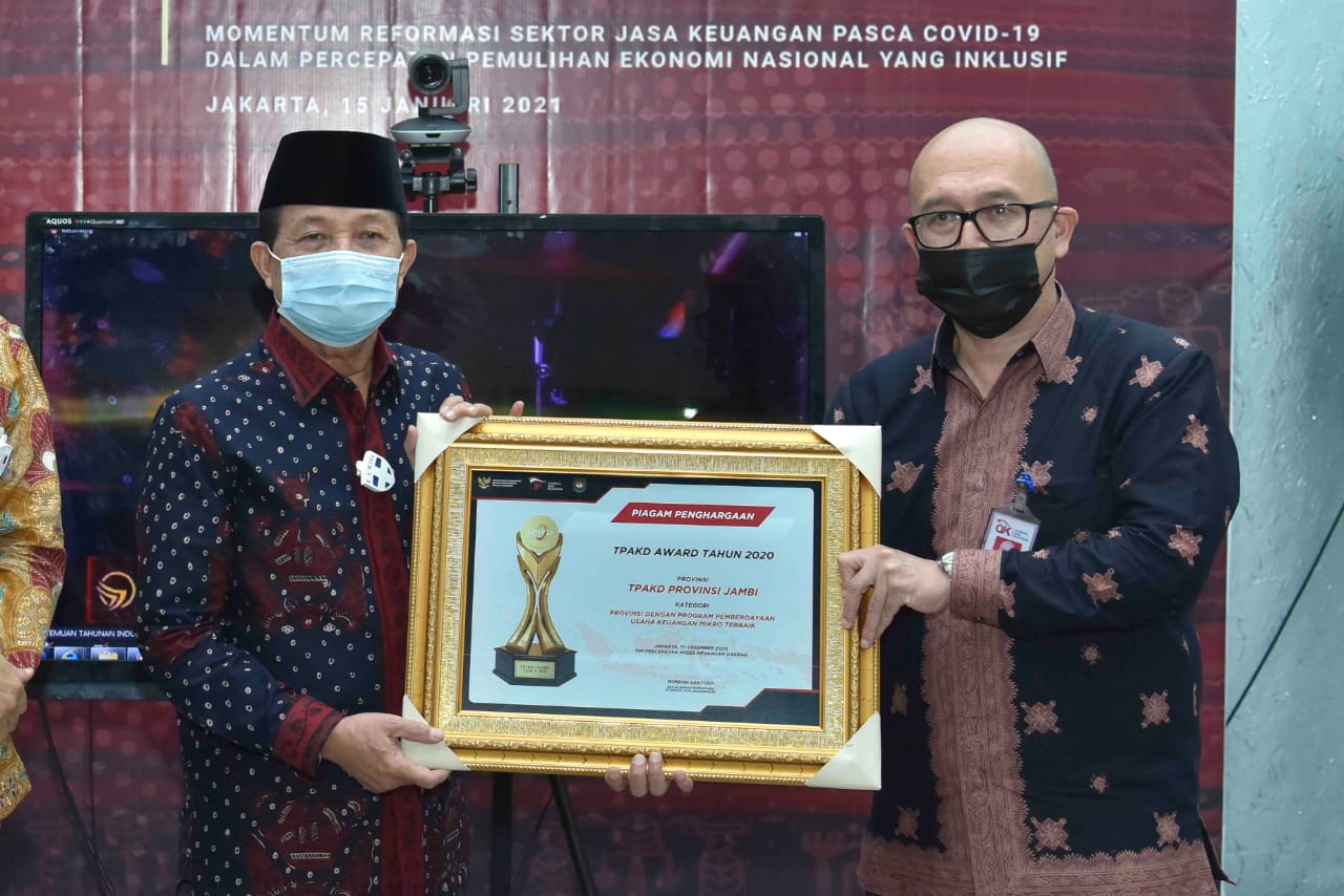 SUARA JAMBI – Dalam pertemuan tahunan Industri Jasa Keuangan (IJK) Tahun 2021 yang dilaksanakan secara virtual pada Jum’at (15/01/2021) malam, Gubernur Jambi Fachrori Umar dianugerahi TPAKD (Tim Percepatan Akses Keuangan Darah) Award 2020.