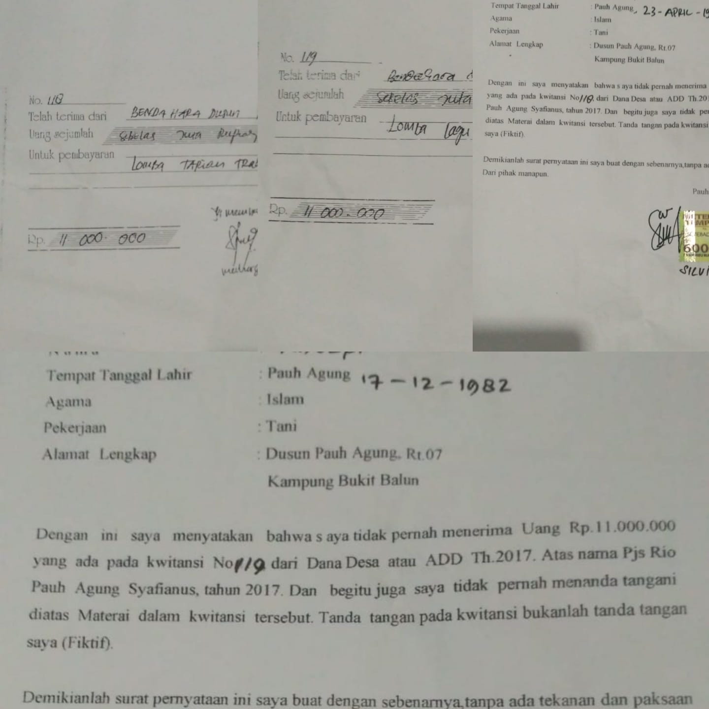 Gasak Dana Desa, Plt Rio, Sekdus dan Bendahara Pauh Agung Diduga Bikin Kwitansi Palsu