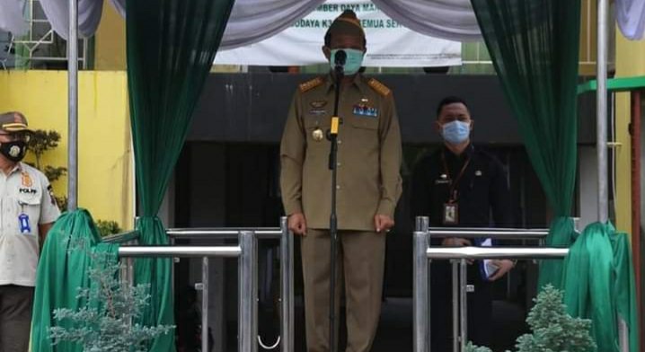 SUARA JAMBI – Gubernur Jambi, Fachrori Umar, memimpin upacara peringatan Bulan Keselamatan Kerja (K3) Nasional Tingkat Provinsi Jambi, di halaman kantor Dinas Tenaga Kerja dan Transmigrasi Provinsi Jambi, Kamis (04/2/2021).