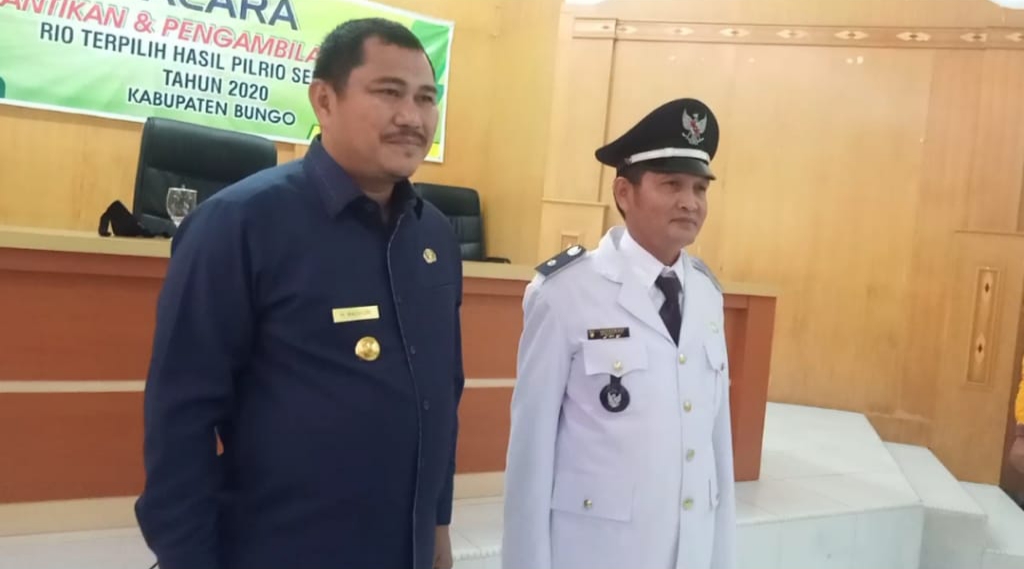 Pelantikan tersebut di gelar serentak dengan delapan orang Rio lainnya dari Kecamatan Tanah Sepenggal dan Kecamatan Tanah Tumbuh, di Ruang Pola Kantor Bupati Bungo, Jumat (17/4/2020).