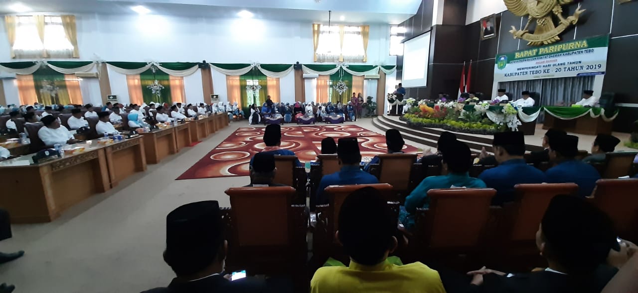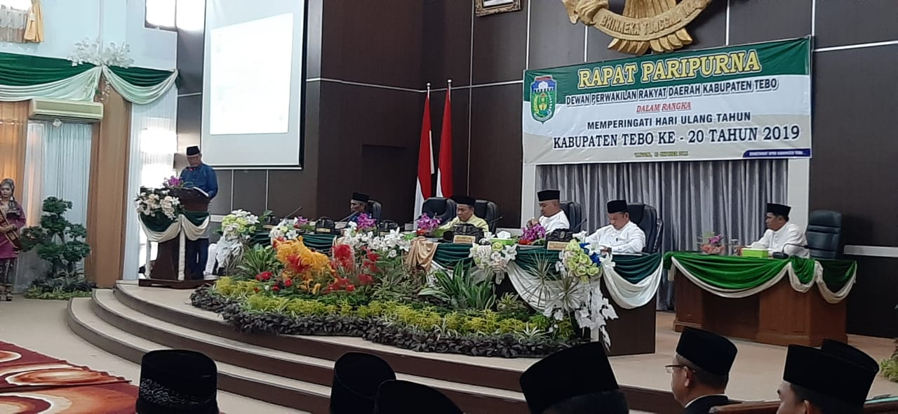 SUARA TEBO – Gubernur Jambi yang diwakili Asisten II Sekda Provinsi Jambi, Ir. Agus Sunaryo, M.Si menghadiri Rapat Paripurna DPRD Kabupaten Tebo dalam rangka memperingati Hari Ulang Tahun Kabupaten Tebo Ke-20 tahun 2019 yang bertempat di ruang sidang utama DPRD Kabupaten Tebo, Sabtu (12/10/2019).