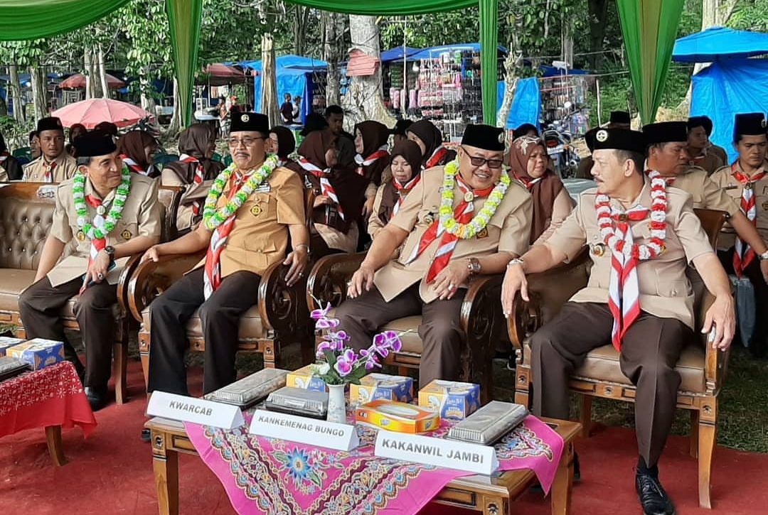 Kakanwil Provinsi Jambi di dampingi kakan kemenag Provinsi Jambi, Kabid Madrasah, Kak Kwarcab Bungo, Camat dan kepala TU, kasi serta Pengawas Kabupaten Bungo, anggota DPRD Kabupaten Bungo, dan para tamu undangan lainnya ikut hadir di acara Pembukaan Perkemahan Akbar di Dusun Mangun Jayo tersebut.