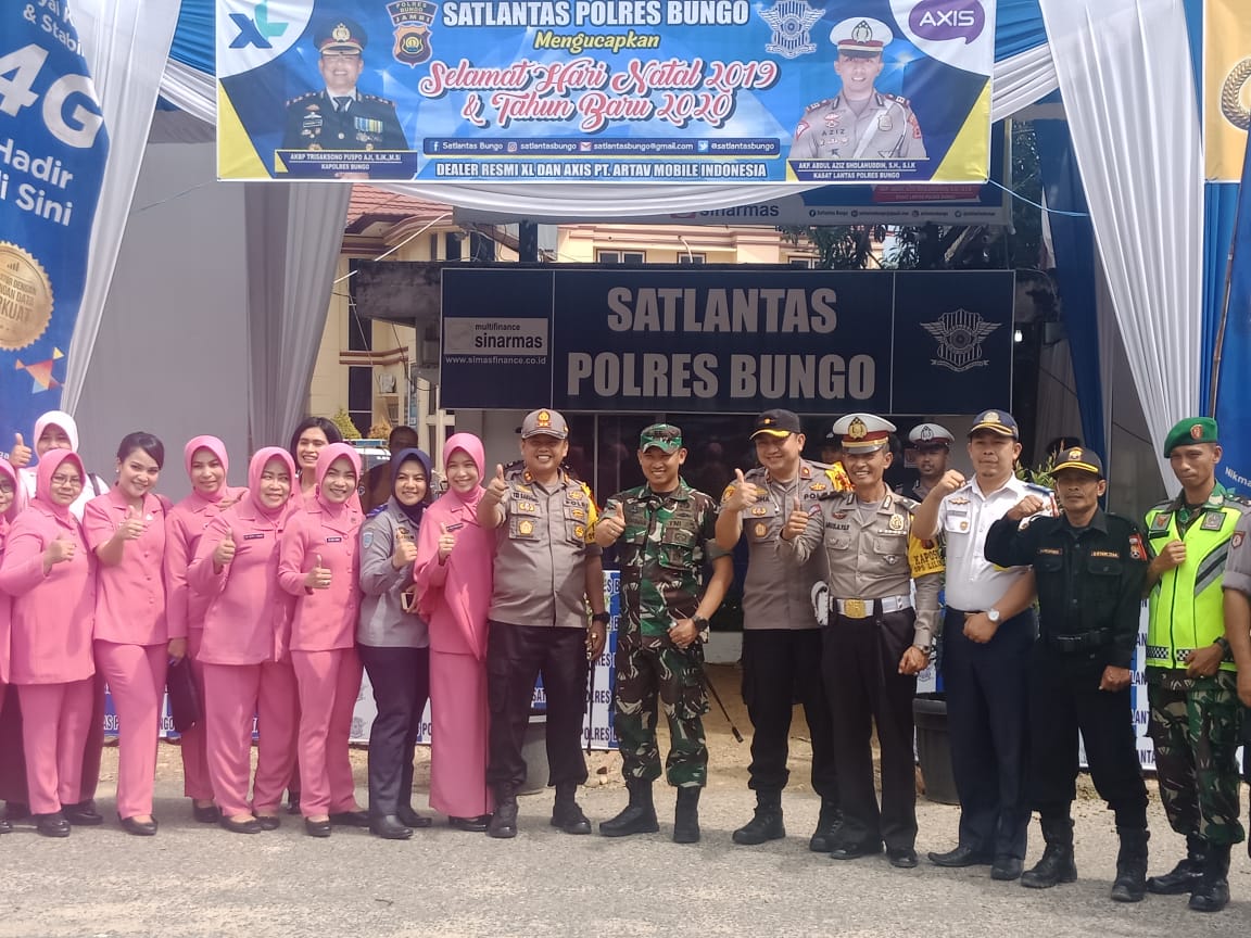 SUARA BUNGO – Kapolres Bungo, AKBP Trisaksono Puspo Aji, S.I.K., M.Si, bersama Ketua Bhayangkari Polres Bungo, PJU Polres Bungo dan Komandan Kodim 0416 Bute, Letkol Inf Widi Rahman, S.H., M. Si secara langsung melaksanakan kunjungan ke Posyan Simpang Samsat, PosPam Hypermart dan Pospam Gereja Operasi Lilin 2019, Senin (30/12/2019).