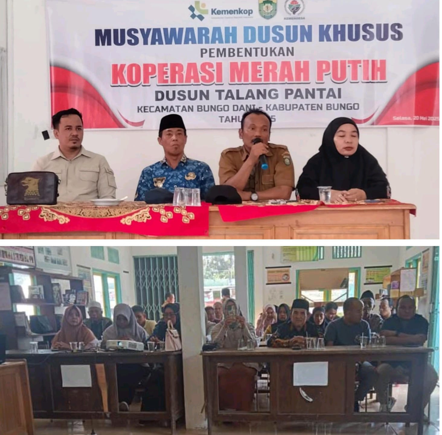 SUARA BUNGO – Pemerintah Dusun Talang Pantai, Kecamatan Bungo Dani, Kabupaten Bungo sukses melaksanakan ??Musyawarah Dusun Khusus untuk membentuk Koperasi Merah Putih di Dusun Talang Pantai yang digelar di Gedung Serba Guna, Dusun Talang Pantai, Selasa (20/05/2025).