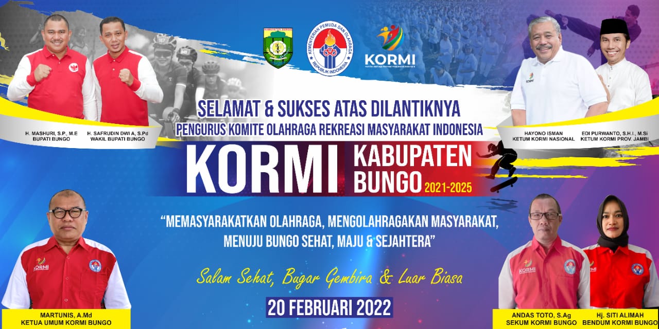 SUARA BUNGO – Pelantikan pengurus Komite Olahraga Rekreasi Masyarakat Indonesia (KORMI) Kabupaten Bungo akan dilaksanakan pada Minggu pagi (20/02/2022).