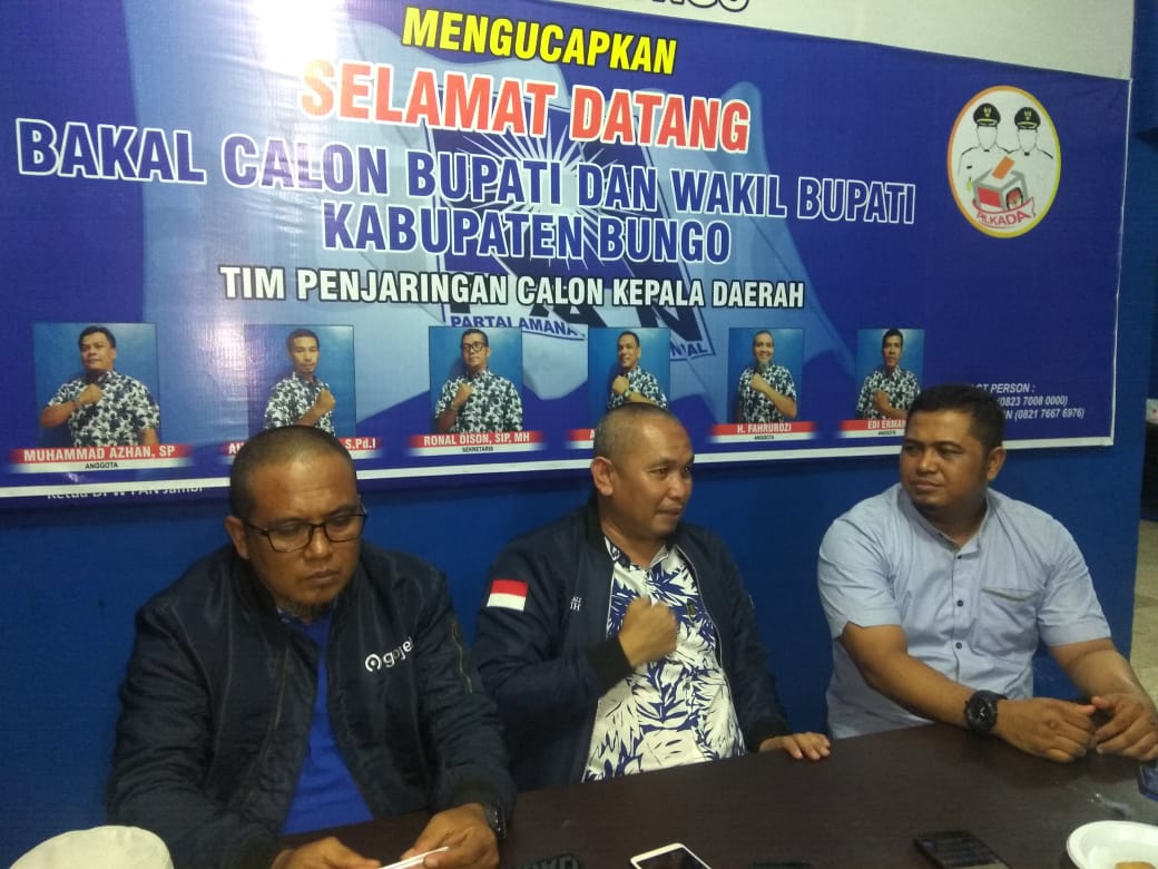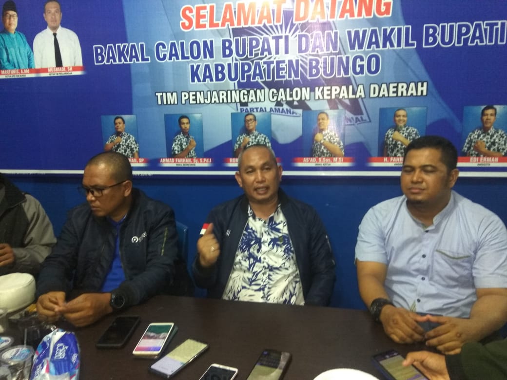 Putra terbaik Batang Bungo ini yang juga mantan Ketua DPRD Bungo Priode 2009-2014 dan juga anggota dewan 2014-2019 didepan simpatisan dan awak media mengatakan, dirinya yakin 100 persen akan diusung oleh Partai PAN, karena dirinya merupakan kader murni partai pemenang pemilu dua kali berturut-turut ini.