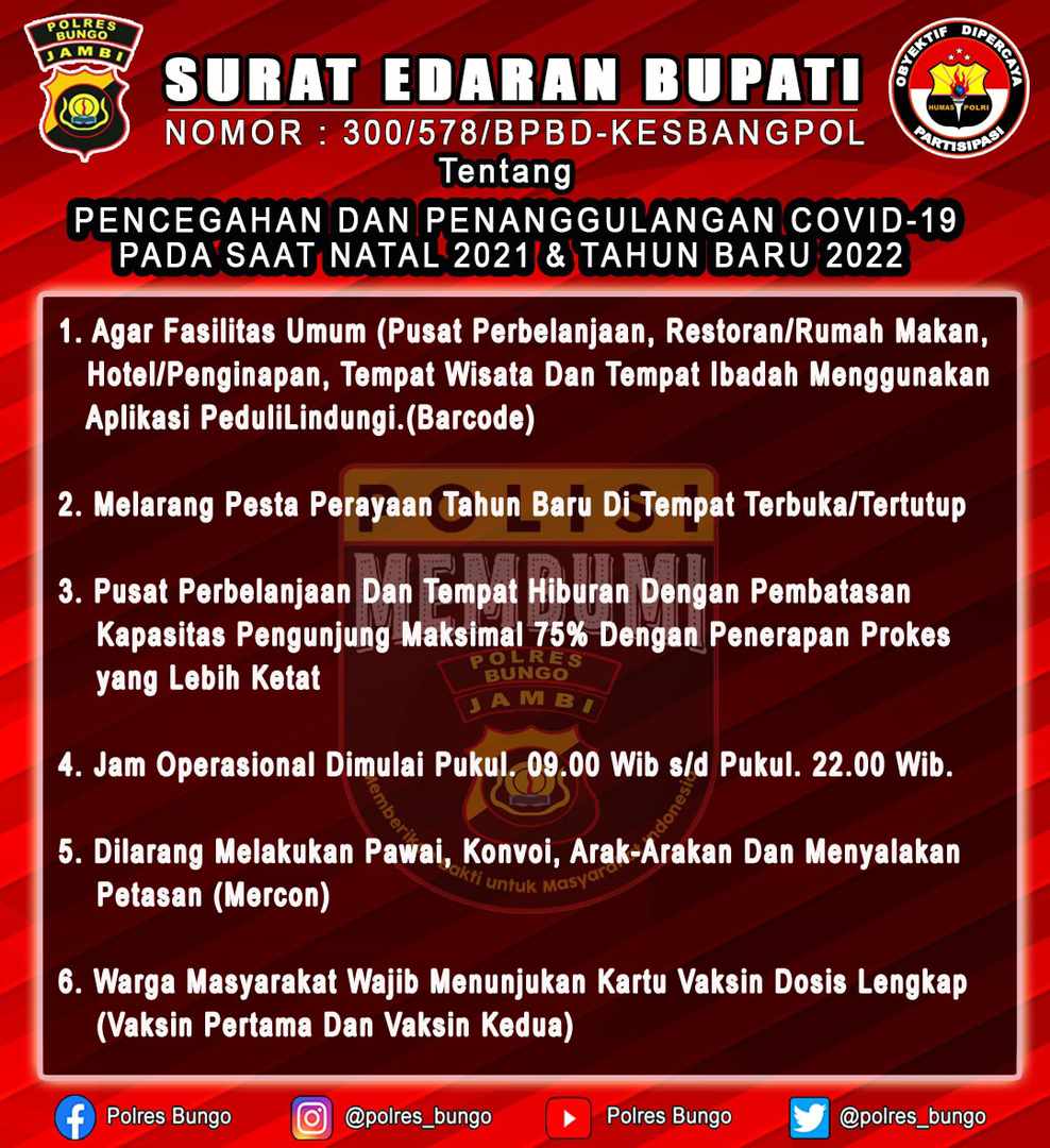 Jam malam ini berlaku dari tanggal 31 Desember 2021 sampai dengan tanggal 1 Januari 2022 mendatang, agar masyarakat Kabupaten Bungo tidak ada mengadakan aktivitas pada malam pergantian tahun.
