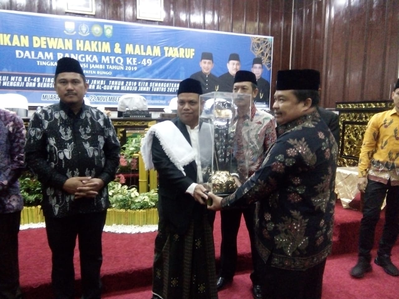 Bupati Bungo, H. Mashuri, Wakil Bupati Bungo, H Safrudin Dwi Aprianto beserta istri. Kakan Kemenag Bungo H. M. Ikbal, unsur forkopimda Provinsi Jambi, forkompimda Bungo, DPRD Bungo serta tamu undangan lainnya ikut menyaksikan Malam ta’aruf sekaligus pelantikan 100 Dewan Hakim dan panitra MTQ ke-49 tingkat Provinsi Jambi.