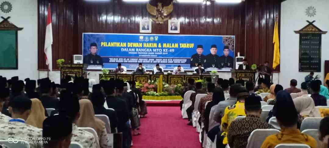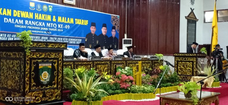 SUARA BUNGO – Malam ta’aruf sekaligus pelantikan 100 Dewan Hakim dan panitra MTQ ke-49 tingkat Provinsi Jambi, resmi dilantik oleh Gubernur Jambi yang diwakili oleh Asisten Pemerintahan dan Kesejahteraan Rakyat Provinsi Jambi, H. Afandi Saharudin, Jumat malam (15/11/2019) di gedung DPRD Bungo, Kecamatan Rimbo Tengah.