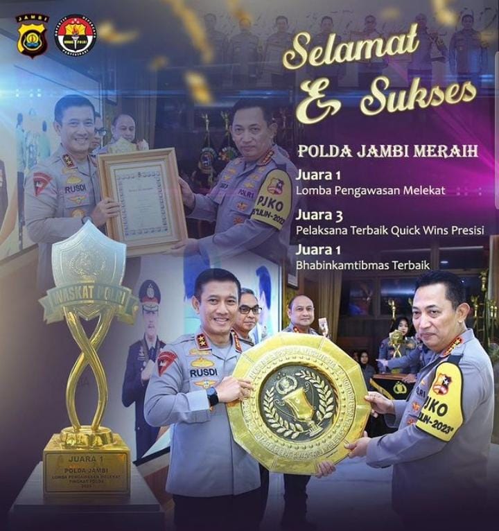 Kapolda Jambi Irjen Pol. Rusdi Hartono melalui Kabid Humas Polda Jambi Kombes Pol. Mulia Prianto menyebutkan 3 penghargaan tersebut di dapat dari kategori, Juara 1 Pengawasan , Juara 3 Quick Wins Presisi Triwulan III dan Juara 1 Bhabinkamtibmas terbaik.