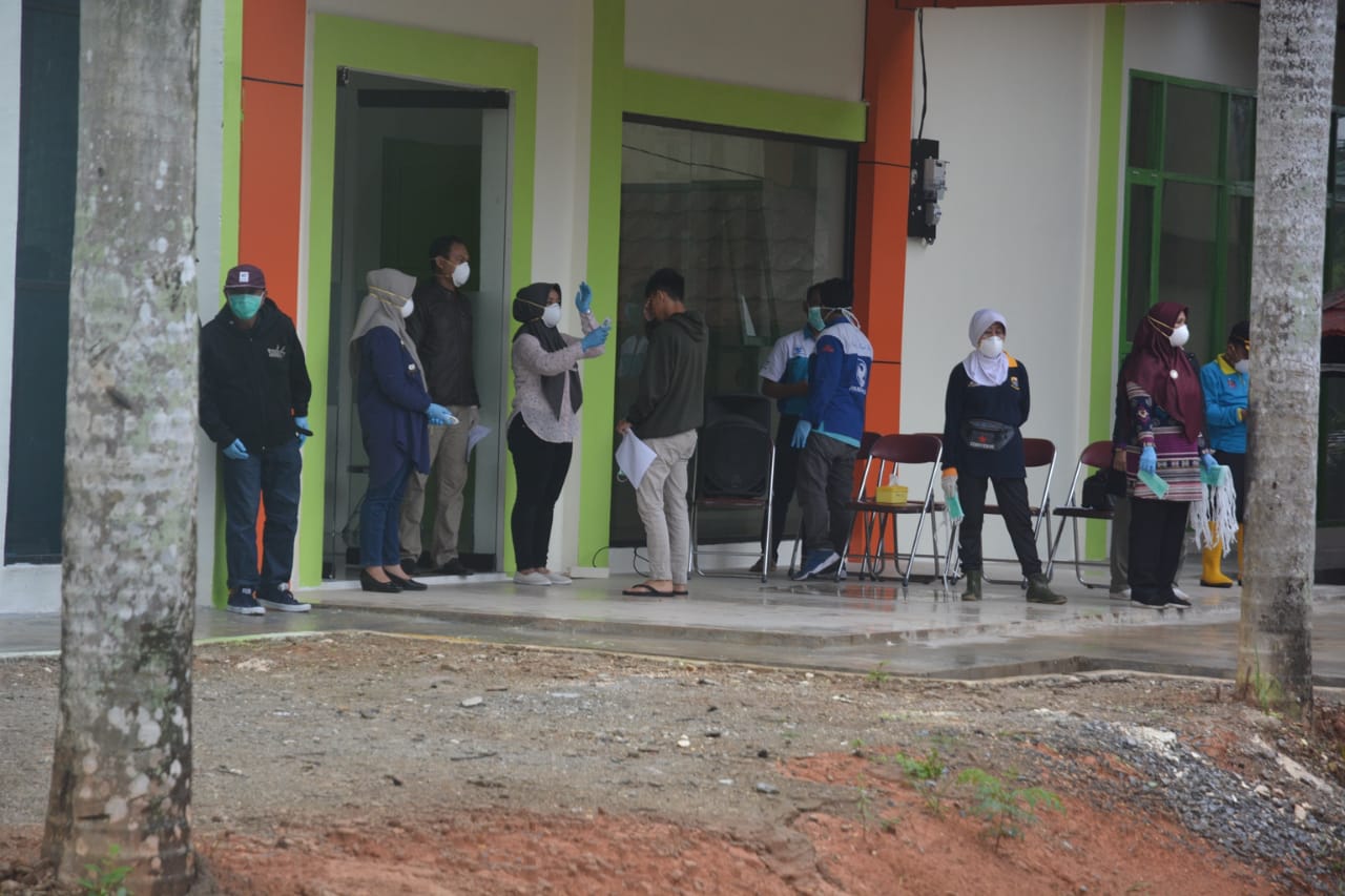 Personil teknis dari Tim Terpadu Penanganan Covid-19 langsung menyemprotkan disinfektan, selanjutnya diukur suhu tubuh pada saat screening berlangsung, socal distancing diterapkan Setelah 2 bis pariwisata yang membawa rombongan field trip tiba di halaman Bapelkes Provinsi Jambi, begitu rombongan turun dari pintu bis.