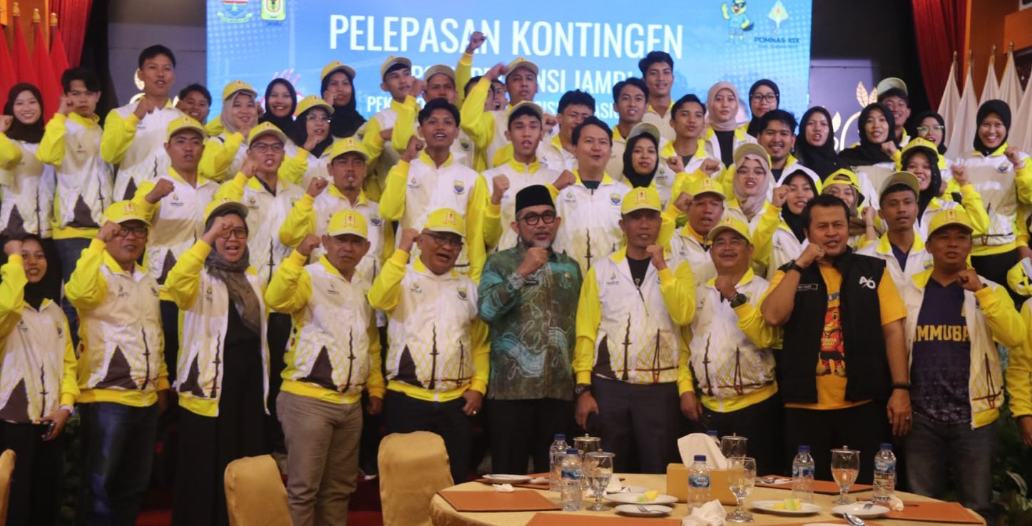 SUARA JAMBI – Sekretaris Daerah Provinsi Jambi, Dr. H. Sudirman, SH., MH., secara resmi melepas Kontingen Badan Pembina Olahraga Mahasiswa Indonesia (BAPOMI) Provinsi Jambi yang akan berlaga pada Pekan Olahraga Mahasiswa Nasional (POMNAS) XIX Tahun 2025. Ajang bergengsi tingkat nasional tersebut akan digelar di Jawa Tengah pada 16 hingga 27 September 2025, dengan menghadirkan ribuan mahasiswa atlet dari seluruh Indonesia. Prosesi pelepasan kontingen dilaksanakan di Auditorium Rumah Dinas Gubernur Jambi, Jum’at (12/09/2025) malam.