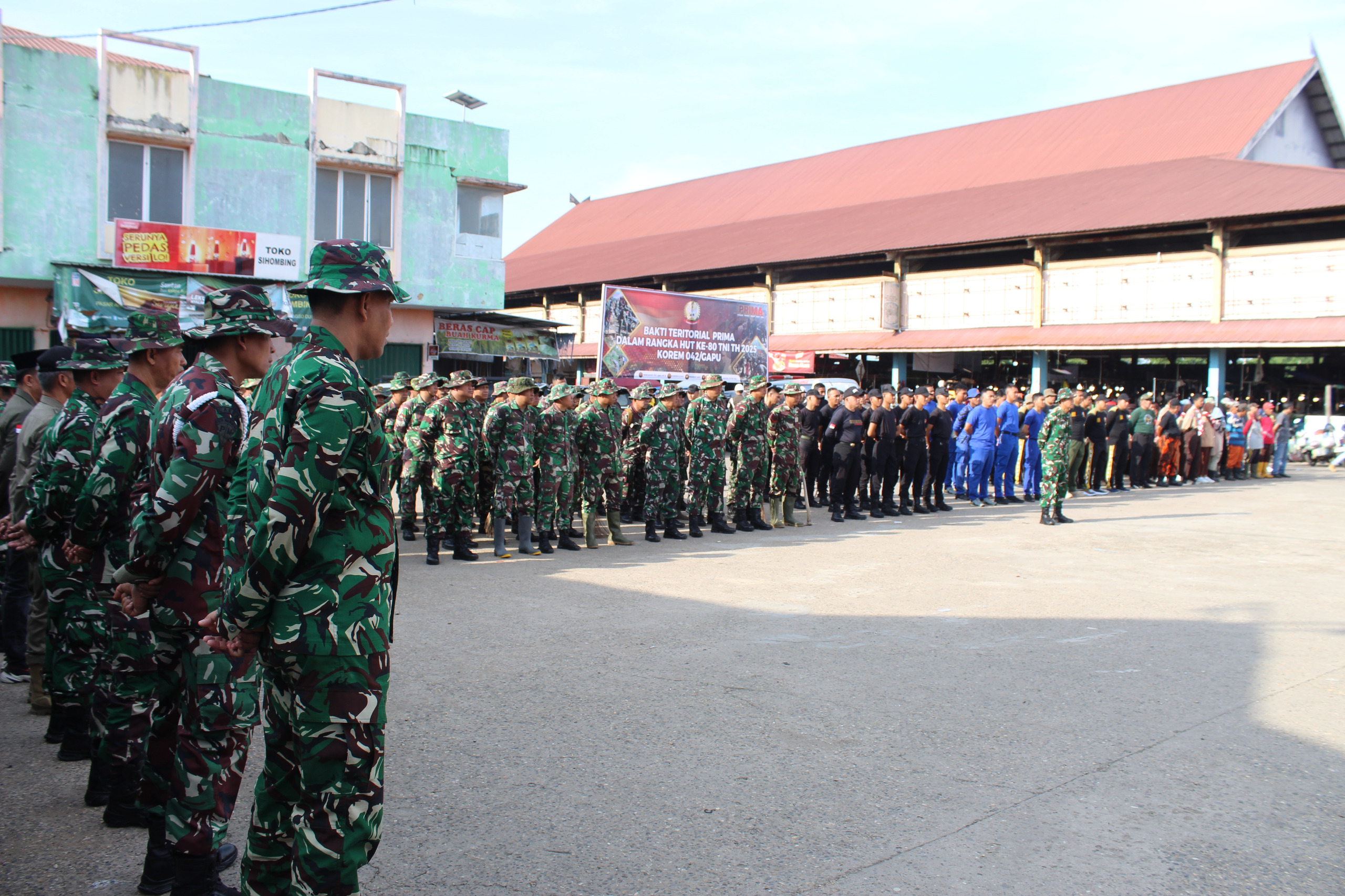 Kegiatan ini melibatkan berbagai elemen masyarakat, mulai dari TNI, Polri, Polairud, Brimob, Satpol PP, FKPPI, Pramuka, DPD P3AD Jambi, pelajar, hingga warga pasar. Sinergi ini selaras dengan tema peringatan HUT TNI ke – 80 : “TNI Prima, TNI – Rakyat, Indonesia Maju.”