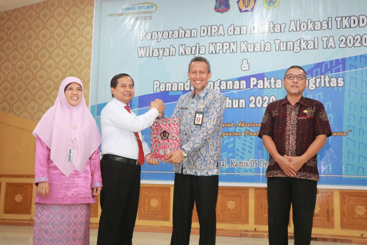 Penghargaan tersebut diserahkan langsung pada acara penyerahan daftar isian pelaksanaan anggaran (DIPA) dan daftar alokasi Wilayah kerja KPPN Kuala Tungkal Tahun 2020 dan Penandatanganan fakta Integritas Tahun 2020, dengan tema yang diangkat, “APBN untuk akselerasi daya saing melalui inovasi dan penguatan kualitas sumber daya manusia”.