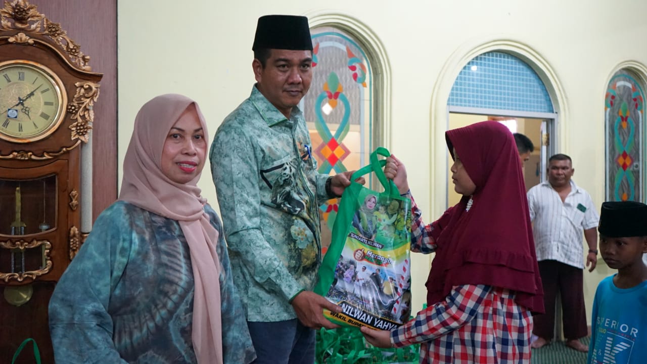 SUARA BANGKO – Wabup Merangin Nilwan Yahya dan Wakil Ketua TP PKK Merangin Ny Juniarti Nilwan, menyantuni sebanyak 41 orang anak yatim yang berdomisili di sekitar rumah dinas wakil bupati Merangin, Rabu (13/4/2023).